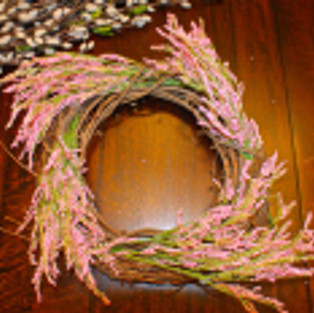 14 pussy willow stems. 4 stems of pink buds. 12″ twig wreath form. 6′ roll of cotton chevron ribbon. floral wire. scissors.